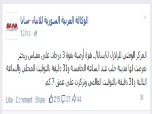 نشرت الوكالة العربية السورية للأنباء (سانا) خبرا على صفحتها الرسمية على الفيس بوك خبرا يستغبي به مؤيدو الأسد، حيث ذكرت أن المركز الوطني للزلال شعر بهزة أرضية قوتها 3 درجات على مقياس رختر تعرضت لها مدينة حلب عند الساعة 5:31 بتوقيت سوريا، وهو بنفس توقيت نسف مبنى المخابرات الجوية الذي قام به الثوار، حيث حفروا نفقا تحت المبنى وقاموا بتفخيخه وتفجيره ليصير مبنى المخابرات شبه مدمر.