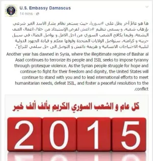 عايدت السفارة الأمريكية في دمشق ، على صفحتها على موقع التواصل الاجتماعي " فيس بوك" ، الشعب السوري بمناسبة حلول عام 2015 ، المنشور تقول فيه السفارة: