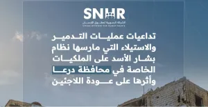 أصدرت "الشَّبكة السورية لحقوق الإنسان" اليوم تقريراً بعنوان "تداعيات عمليات التدمير والاستيلاء التي مارسها نظام بشار الأسد على الملكيات الخاصة في محافظة درعا وأثرها على عودة اللاجئين والنازحين"، سلَّطت فيه الضوء على سياسة التدمير المتعمدة والمنهجية التي اتبعها نظام الأسد للاستيلاء على المنازل والأراضي والعقارات، مستخدماً في ذلك مجموعة واسعة من القوانين والتشريعات التي تفتقد إلى الشرعية القانونية.