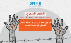 ووفقاً للتقرير فقد تمَّ توثيق 123 حالة احتجاز تعسفي في شباط/ فبراير 2025، بينهم 6 أطفال و1 سيدة (أنثى بالغة)، حيث كانت 21 حالة منها على يد الحكومة الانتقالية، كما وثق التقرير 34 حالة اعتقال بينهم 1 سيدة على يد جميع فصائل المعارضة المسلحة/ الجيش الوطني، إضافة إلى 68 حالة اعتقال، بينهم 6 أطفال على يد قوات سوريا الديمقراطية.