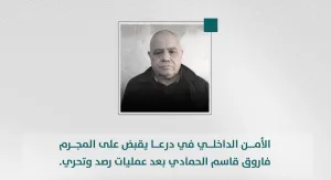 تمكنت قوى الأمن الداخلي في درعا من إلقاء القبض على فاروق قاسم الحمادي، وذلك بعد عمليات رصد وتحري دقيقة. ويعد الحمادي شخصية بارزة في المنطقة، حيث كان عضوًا في مجلس الشعب السوري سابقًا، واشتهر بتعاونه مع الأجهزة الأمنية التابعة للنظام البائد.