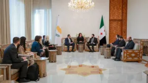 وكان استقبل الرئيس السوري أحمد الشرع، يوم الخميس، برفقة وزير الخارجية أسعد الشيباني، وفداً قبرصياً برئاسة كومبوس في قصر الشعب بدمشق. وقد تناول الاجتماع العديد من القضايا المهمة، من بينها موقف قبرص من رفع العقوبات عن سوريا.
