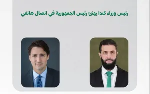 تلقي رئيس الجمهورية العربية السورية السيد أحمد الشرع، اتصالاً هاتفياً من رئيس الوزراء الكندي السيد جاستن ترودو، حيث هنأ رئيس الوزراء الكندي "الشرع" بتوليه رئاسة الجمهورية العربية السورية، وأكد على دعم كندا للشعب السوري لتحقيق التقدم والاستقرار وتعزيز الأمن في سوريا.