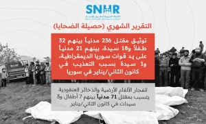 رغم سقوط نظام الأسد واستلام الإدارة السورية الجديدة السلطة، لا تزال سوريا تشهد انتهاكات خطيرة بحق المدنيين، حيث وثقت الشبكة السورية لحقوق الإنسان مقتل 236 مدنياً خلال كانون الثاني/يناير 2025، بينهم 32 طفلاً و18 سيدة.