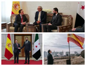 قالت مصادر من دمشق، إن وفد مملكة إسبانيا برئاسة وزير الخارجية والتعاون "خوسيه مانويل ألباريس"، الذي التقى "أحمد الشرع" قائد الإدارة السورية الجديدة، اليوم الخميس، في دمشق، زار مقر السفارة الإسبانية في دمشق، وقام برفع العلم الإسباني على مبنى السفارة إيذاناً بإعادة استئناف نشاطها.