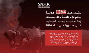 قالت "الشَّبكة السورية لحقوق الإنسان" في تقريرها الصادر اليوم إنَّ 503 مدنيين قد قتلوا في سوريا في كانون الأول/ديسمبر 2024، بينهم 96 طفلاً و49 سيدة، و4 ضحايا بسبب التعذيب بينهم طفل واحد وسيدة واحدة. كما وثَّقت الشَّبكة السورية لحقوق الإنسان مقتل 1264 مدنياً في سوريا في عام 2024، بينهم 242 طفلاً و118 سيدة، و86 ضحية بسبب التعذيب.