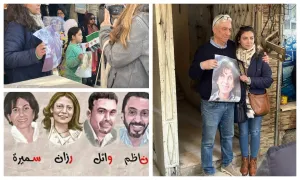 نظم نشطاء وشخصيات حقوقية سورية، وقفة أمام مكتب "مركز توثيق الانتهاكات" في مدينة دوما بريف دمشق، طالبوا فيه بكشف مصير الحقوقيين "رزان زيتونة" ورفاقها المغيبين منذ سنوات وسط مصير مجهول لهم، مطالبين بتحقيق العدالة ومحاسبة المجرمين المتورطين.