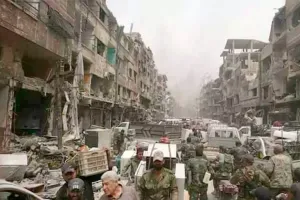 هذا مقطع من شريط فيديو تداوله كثيرون على موقع التواصل الاجتماعي فيسبوك ويصوّر محاولة من إعلامي في «لواء القدس»، الموالي لنظام الرئيس السوري بشار الأسد، تصوير بيته في مخيم اليرموك فيما أفراد من «الجيش العربي السوري» يقومون بسرقة أغراض بيته وبيوت جيرانه ضمن عملية ممنهجة شاملة لنهب ما بقي في بيوت سكان مخيم اللاجئين الفلسطينيين الأكبر في سوريا بعد تدميره وتهجير سكانه.