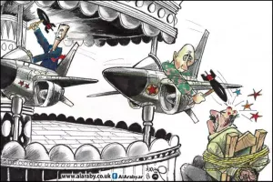 افعل كل ما تريد، أما نحن سنكون مرّة في خلفية المشهد، عندما نفاوض ونساجل ونتبجح بالقوانين وسيادة الدول، ومرّة في مقدمة المشهد، عندما نضرب بأسلحتنا الفتاكة، ونقود المعارك، ويستعرض زعيمنا على شاشات عملاقة أسلحتنا الفاخرة، مثل إعلان تجاري مبهر.