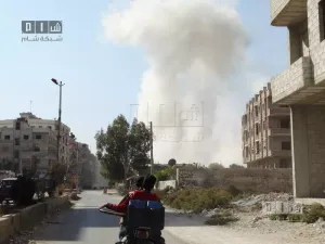 استهدف الثوار بقذائف "بي9" وبالرشاشات الثقيلة مبنى تتمركز بداخله قوات النظام في قرية عين الجوزة.