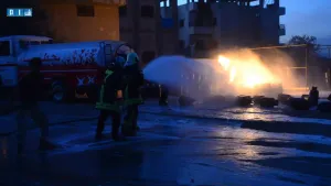 نشب حريق ناتج عن اشتعال أنبوب للغاز بالقرب من احدى محطات الموقود في مدينة بنش بريف إدلب وتمكنت فرق الدفاع المدني من السيطرة على الحريق قبل وصوله إلى أبار البانزين والديزل المتواجدة في المحطة.