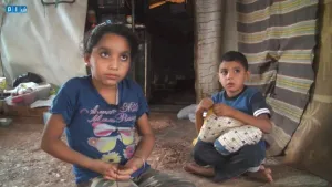 من مخيم " أطمة "... حسن و دلال طفلان مصابان بضمور في النخاع الشوكي . مما فاقم من معاناتهما، فاجتمعت عليهما معاناة المرض و معاناة الفقر تحت سقف الخيمة.