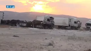فيديو يظهر احتراق شاحنات تحمل مساعدات إغاثية جراء قصف الطيران الروسي الطريق الوصل إلى معبر باب السلامة الحدودي مع #تركيا