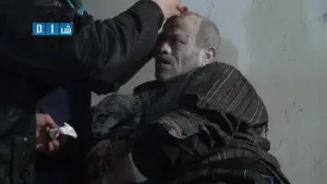 اسعاف رجل بعد اصابته بالقصف على مدينة دوما