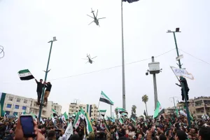 ومن بين المظاهر اللافتة في تلك الاحتفالات، برز تحليق الطيران المروحي فوق سماء مدينة إدلب وساحة الأمويين في دمشق، في مشهد حمل دلالات رمزية واضحة.