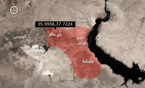 وأوضحت الهيئة أن المنطقة المحددة باللون الأحمر (دير حافر، مسكنة) أصبحت منطقة عسكرية مغلقة اعتباراً من تاريخ اليوم الثلاثاء 13 كانون الثاني، داعية المدنيين إلى الابتعاد عن مواقع التنظيم في هذه المنطقة حفاظاً على أرواحهم.