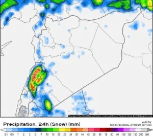 كما يُتوقع تساقط الثلوج بدءاً من الليلة وحتى فجر الأربعاء على المرتفعات التي يزيد ارتفاعها على 1000 متر، ولا سيما في الساحل والقلمون وجبل العرب، إلى جانب موجة صقيع متوسطة الشدة اعتباراً من فجر الأربعاء، ما قد يؤثر على حركة السير والأنشطة اليومية.
