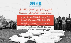 قالت الشَّبكة السورية لحقوق الإنسان في تقريرها الصادر اليوم، إنَّ 80 مدنياً قد قتلوا في سوريا في كانون الأول/ديسمبر 2025، بينهم 11 طفلاً و8 سيدات، و2 ضحية بسبب التعذيب، كما وثقت الشَّبكة السورية لحقوق الإنسان مقتل 3338 شخصًا في عام 2025، بينهم 328 طفلًا و312 سيدة، و32 ضحية بسبب التعذيب.