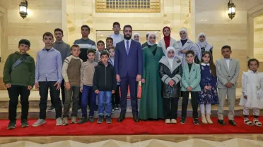"الشرع" وعقيلته يلتقيان أطفال الشهداء والمتفوقين بمناسبة اليوم العالمي للطفل