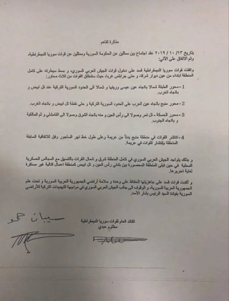 في عام 2019، وقّعت قيادة قسد، ممثلة بمظلوم عبدي وسيبان حمو، على مذكرة تفاهم تقبل صراحة بانتشار قوات الجيش العربي السوري على مساحات واسعة من شمال وشرق البلاد، وتؤكد الالتزام بوحدة الأراضي السورية والعمل تحت راية الجمهورية العربية السورية.