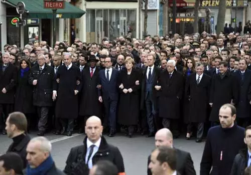 صورة جماعية تمثلت في اجتماع دولي واسع على شكل تظاهرة مليونية في باريس لمناهضة الارهاب وتنديدا بالاعتداء على جريدة "شارلي ايبدو" الذي ذهب ضحيته احد عشر شخصا تحرك العالم بأسره من اجلهم في ظل صمت دولي حيال المجازر اليومية في سوريا وشهداء شهدا التعذيب في المعتقلات واحد عشر طفلا قضوا جراء البرد في مخيمات اللجوء وعدد من الاطفال ماتوا جوعا في البلدات المحاصرة في سوريا .