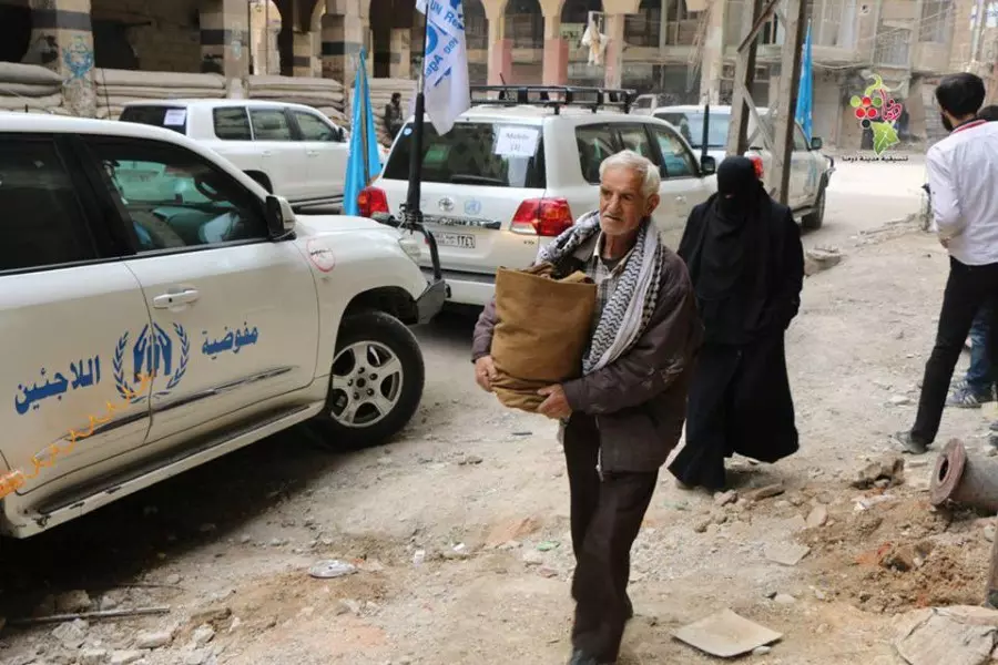 دخلت اليوم قافلة تحمل مساعدات إغاثية وإنسانية إلى مدينة دوما عن طرق الأمم المتحدة بمساعدة الهلال الأحمر السوري، وأكد ناشطون أن القذائف سقطت بالقرب من القافلة على بعد 50 مترا ما تسبب بسقوط عدد من الجرحى بين المدنيين، وذلك في إشارة لعدم أخذ سلامة القافلة ووفد الأمم المتحدة بالاعتبار.