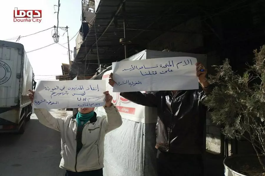دخلت قافلة مساعدات إلى مدينة دوما بالغوطة الشرقية، وتحمل مساعدات إنسانية تكفي ل27،500 شخص فقط من أصل 400 ألف إنسان يعيشون في وضع مأساوي ومرعب، وتحمل المساعدات طرود غذائية وأكياس طحين وبعض اللوازم الطبية التي سمح نظام الأسد بدخولها، وللعلم فقد منع النظام دخول حقائب اسعافية أولية، ولوازم جراحية، وبعد ذلك انسحب وفد الأمم المتحدة الذي دخل مع القافلة قبل إفراغ حمولة المساعدات بسبب القصف الجوي الروسي المكثف على الغوطة.