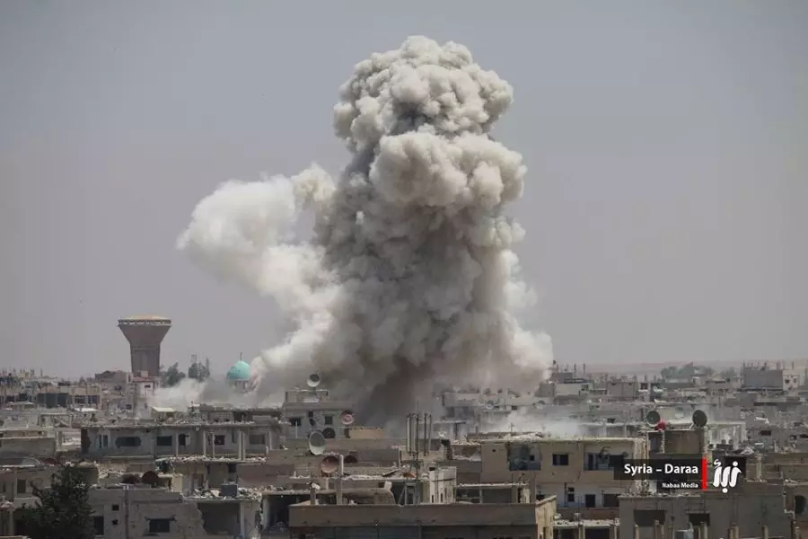 قامت 4 مروحيات تحلق في سماء مدينة درعا بإلقاء أكثر من 40 برميل متفجر يحوي بعضها على النابالم الحارق ترافقت مع أكثر من 36 صاروخ فيل على أحياء درعا البلد وحي طريق السد ومخيم درعا ما أدى لوقوع دمار كبير جدا في المنطقة وخاصة في جامع العمري الأثري والمدمر والذي أدى لإحتراق أجزاء منه، دون تسجيل أي إصابات بين المدنيين، وذلك بسبب لجوء أغلب الأهالي إلى السهول والمزارع، حيث يعانون حر الصيف وقلة في المواد الغذائية والدوائية وشح في الماء الصالحة للشرب.