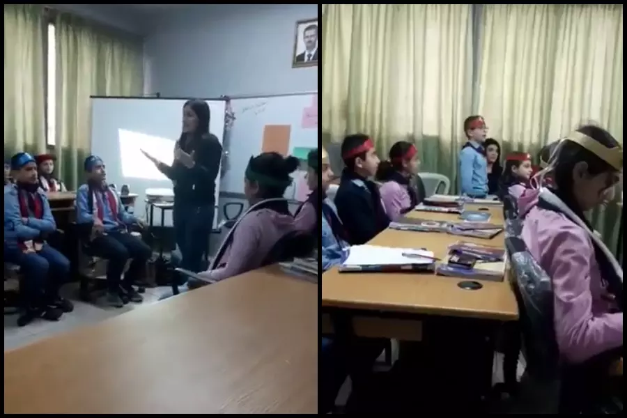 فيديو مثير للجدل .. مُدرسة تعلم تلاميذها شعارات تمجيد وتأييد رأس النظام ..!!