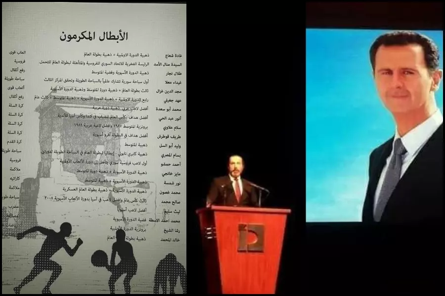 على رأسهم "منال الأسد وغادة شعاع" .. الإرهابي "بشار" يشيّد بالرياضيين ويعتبرهم مكملاً لجيشه