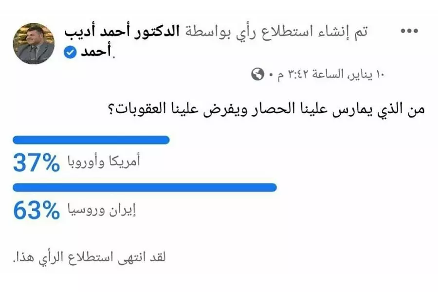 نتيجة صادمة دفعته لمخاطبة "روسيا وإيران" .. استطلاع رأي لـ"باحث علوي" .. "من يمارس علينا الحصار"؟!